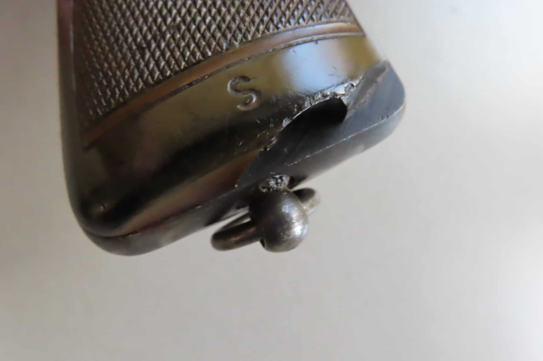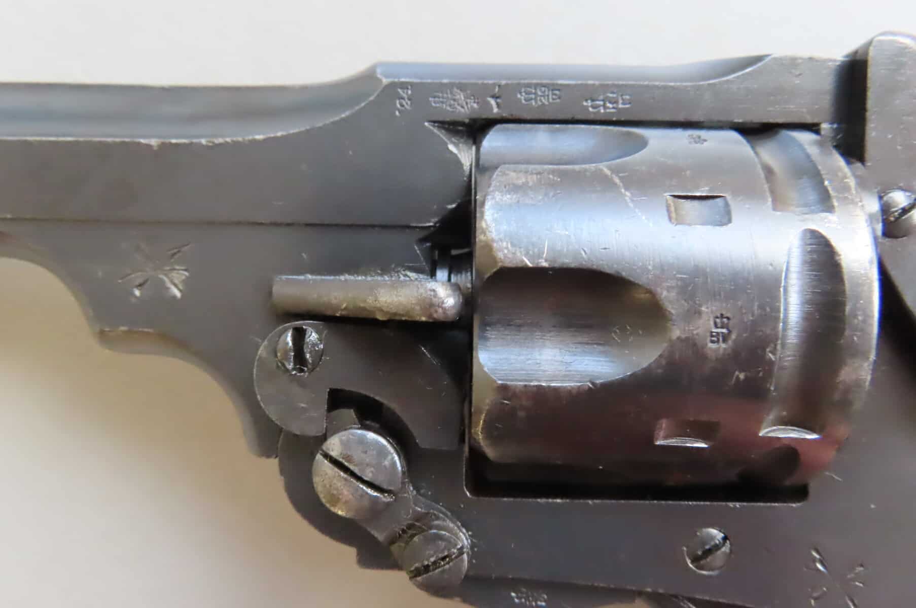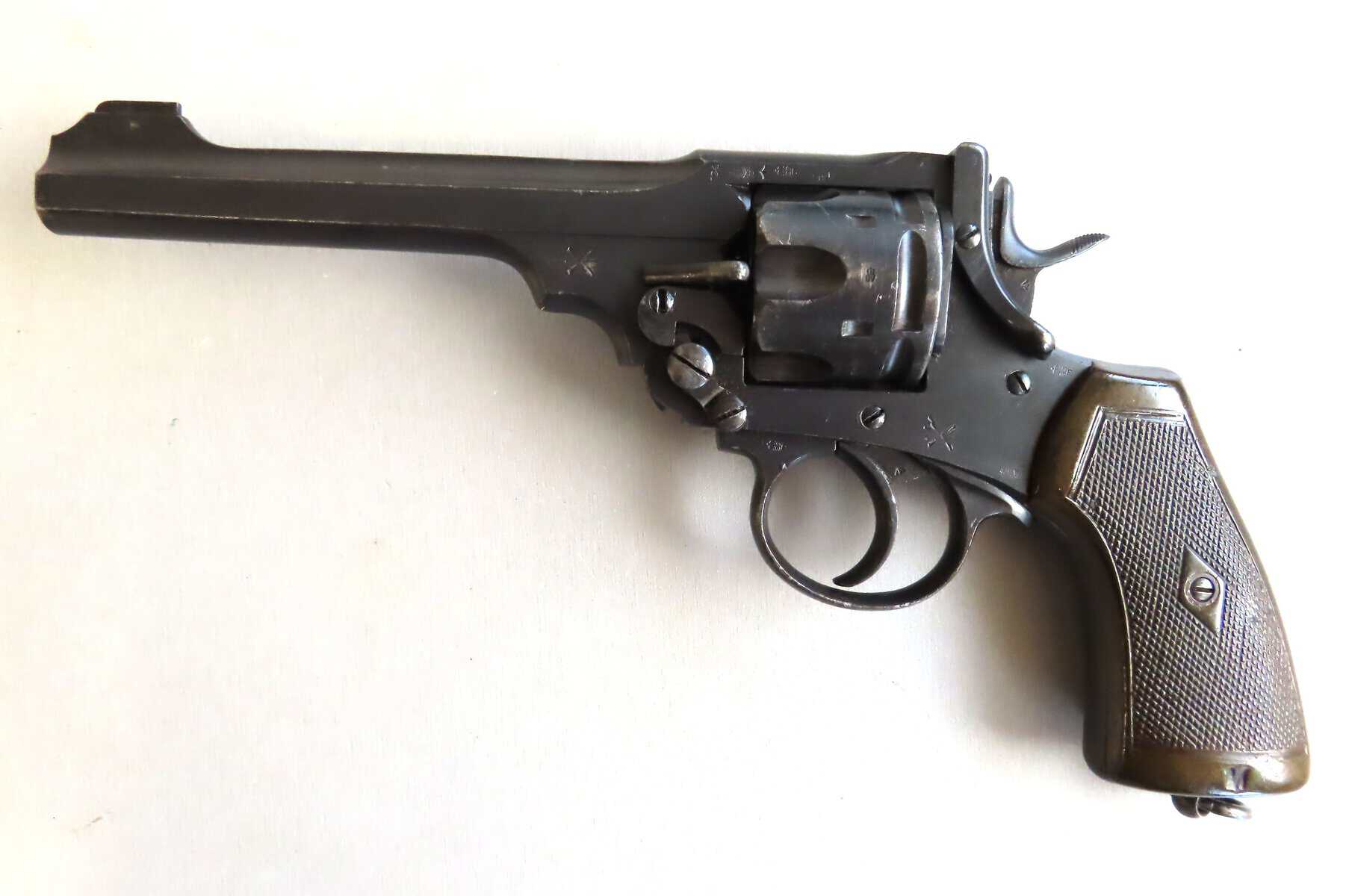 .455 Enfield Mk6 military revolver manufactured in 1924 and appears to have been re furbished for use in WW2. Most re finish remains with quite a few scratches and marks, due to military use. There are two small chips at the very base of the grips as can be seen in the pictures. It is covered with all types of military marks and stamps.